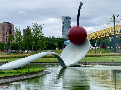 The west side of the river has the big, sophisticated downtown. Lots of tall buildings with the Skyway System – about 10 miles of contiguous enclosed bridges that go at the second story level from building to building, temperature controlled. Besides keeping traffic moving it keeps walkers more comfortable and safer. We’ve headed to the west side of the river for the Minnesota Institute of Art, for the Minneapolis Sculpture Garden, the River Gateway Park, the airport, and places by accident (like I said – you’ve got to watch those addresses).