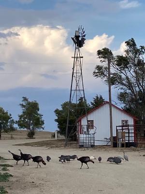 Ranching is hard, can be iffy financially, and the ranchers don’t view their animals sentimentally. So it was such a hoot when we asked Rick what the guinea hens were for (i.e. do you eat them? or sell their eggs?) and were told that they just thought it’d be fun to have them around. The fowl are noisy, ever busy scurrying around, always in a pack. And they just make you laugh. It’s fitting that the collective noun for a group of guinea hens is a “confusion”! We watched a confusion of them chasing after a flock of wild turkeys that went through the yard. We weren’t sure if the guinea hens were chasing the turkeys out or just wanted to join in with their bigger cousins.