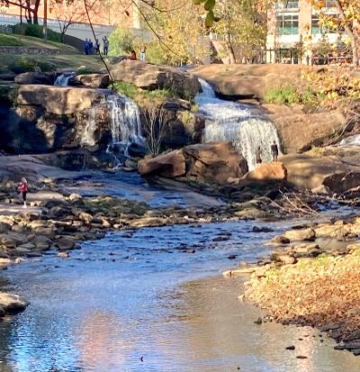 Our long-term stay for November is in Greenville, SC. It is a vibrant small town (pop 75,000) with an Old Port-like downtown, lots of public art, and the 20-mile Swamp Rabbit Trail for walking/biking. The trail was built on the bed of an old railroad and is named after a rabbit indigenous to the area.  And another city with a river, the Reedy, which flows along much of the trail but as its name implies, it’s not a big river, more of a stream with some pretty waterfalls. On yesterday’s walk we saw a great blue heron fishing in the river and a kingfisher flew along the banks. Hopefully before we leave here we’ll see a swamp rabbit! Will let you know if we do.