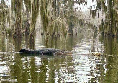 It wasn’t until we left Florida and got to a short layover in Lafayette, LA that we saw alligators. And that involved deliberately taking a tour of a swamp to find them. Sitting in the 12-seat skiff next to a nest of baby alligators with the mother lying close by was thrilling while being quite safe. And then the guide told us how high alligators can raise themselves out of the water, basically their body length. Yikes! Later we learned that these ‘gators were peaceful and that people even swam in parts of the water’. Again, yikes!