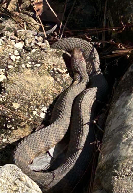 We never did see a bear or an alligator while in Florida for January.  But we did have a snake visitor. He liked to sun on the rock wall between the yard and the swamp. It was either a non-venomous southern water snake or a venomous cottonmouth. The shape of the eye is one way to tell them apart – I passed on getting close enough to make that distinction!