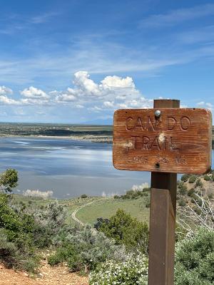 At the top of McPhee Recreational area. The start of the Can Do trail (we did!), overlooking the reservoir, with views of the Abajo mountains to the northwest, the La Plata mountains to southeast, Mesa Verde and the Mountain of Sleeping Ute to the southwest.