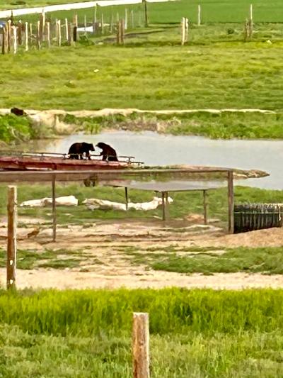 The organization has three locations but only the one we visited is open to the public. In order to minimize the stress on the animals, visitors are restricted to a three-mile-long aerial walkway about 30 feet above the ground. Apparently the animals do not consider anything in the air above them to be encroaching on their territory whereas someone walking outside their fenced area is seen as threatening (or as lunch!). This walkway gave us some great views of the animals, as well as some great views of the surrounding lightning storm! Joe assured us that the geography of the area is such that we were perfectly safe from lightning on this metal bridge up in the sky. Uh-huh! A strong, driving rain did finally cause us to turn around just short of the camels at the end of the walk. But meanwhile we had watched bears playing in the lake, listened to the wolves howling, learned the history of individual big cats, found a western kingbird nest with four eggs, and enjoyed Joe’s knowledge of, and passion for, the sanctuary and its mission.