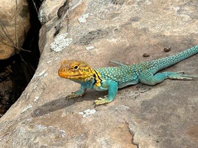 This guy is fast! It’s a common collared lizard. They can run on just their hind legs supposedly. When he did run he was too fast for us to tell how many legs he was using. Looks like he’s wearing pajamas 🙂