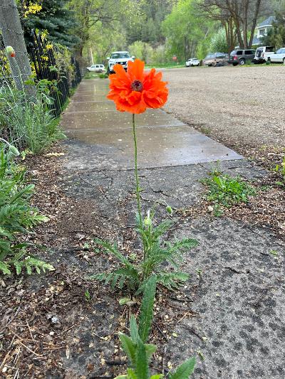 The poppy that got away. A “volunteer” in the sidewalk outside our house. The back yard was full of them but most hadn’t bloomed yet by the time we left.